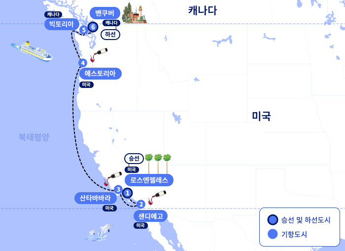 인천-로스엔젤레스[미국] 승선 ▶ 샌디에고[미국] ▶ 산타바바라[미국] ▶ 애스토리아[미국] ▶ 빅토리아[캐나다] ▶ 밴쿠버[캐나다] 하선 - 인천