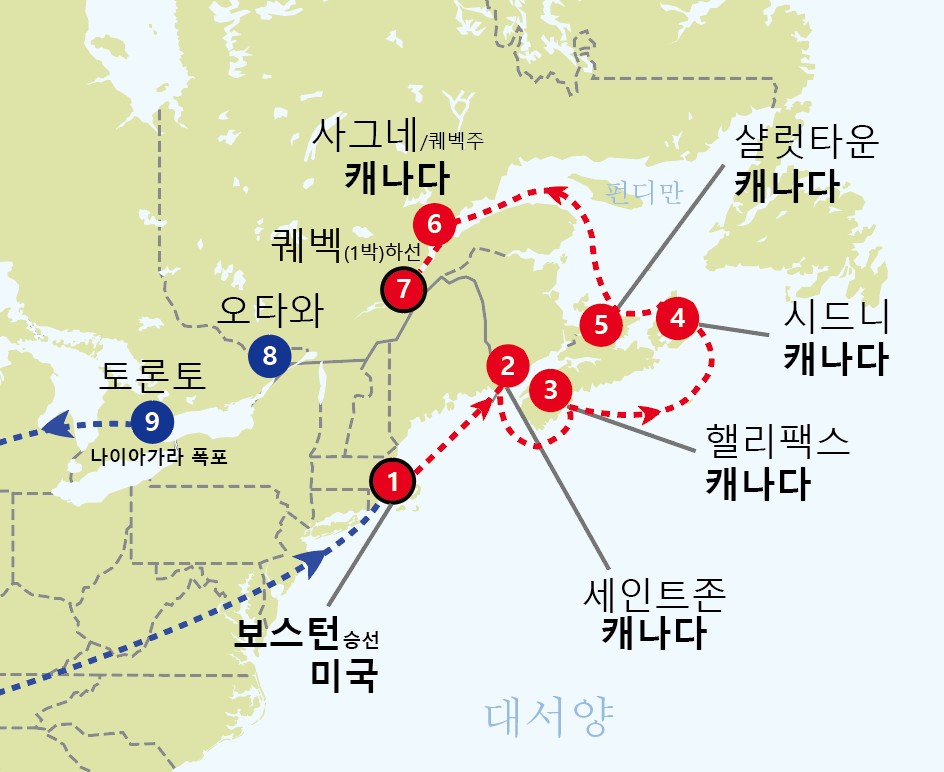 인천-보스턴[미국] 승선 ▶ 세인트존[캐나다] ▶ 전일해상 ▶ 핼리팩스[캐나다] ▶ 시드니[캐나다] ▶ 샬럿타운[캐나다] ▶ 전일해상 ▶ 사그네[캐나다] ▶ 퀘벡[캐나다] ▶ 오타와[캐나다] ▶ 토론토/나이아가라[캐나다]-인천